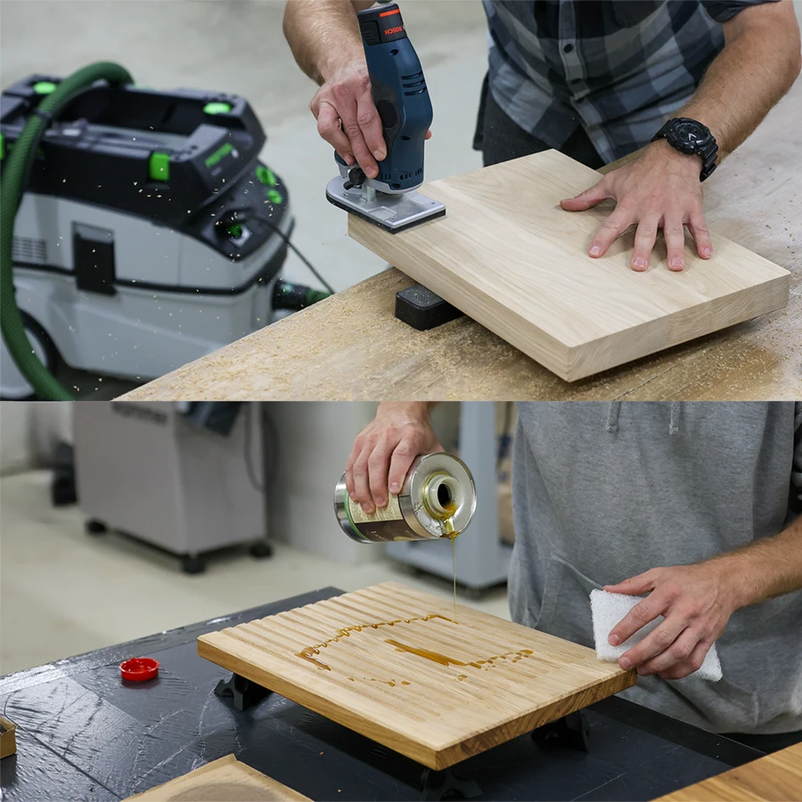 - Griffmulden: Bretter mit 2,5 cm erhalten eine Griffmulde an der Unterseite. Bei 4 cm starken Brettern kann die Griffmulde wahlweise unten oder mittig angebracht werden